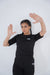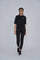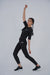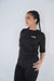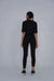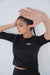 A woman wearing a sleek black activewear set, including a fitted top and leggings, paired with black sneakers. Perfect for workouts or athleisure styling.